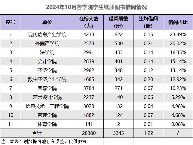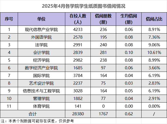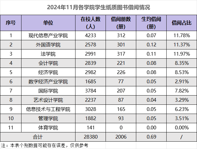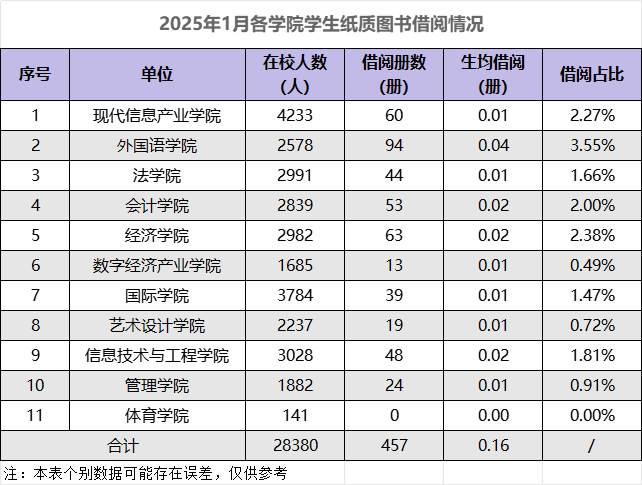 现将学校1月各学院学生读者纸质图书借阅情况公布如下: 图书馆 2025年2月19日