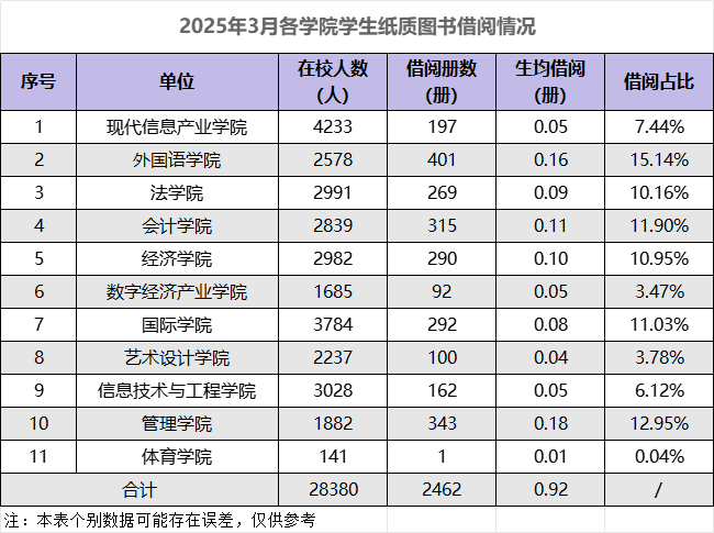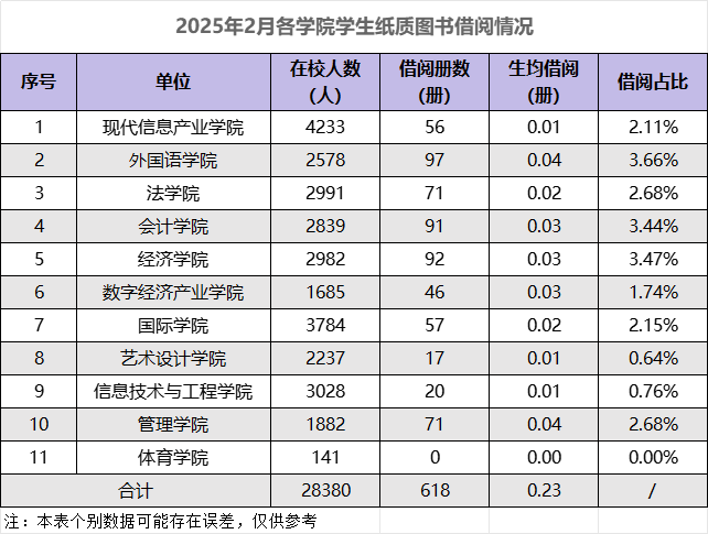现将学校2月各学院学生读者纸质图书借阅情况公布如下: 图书馆 2025年3月3日