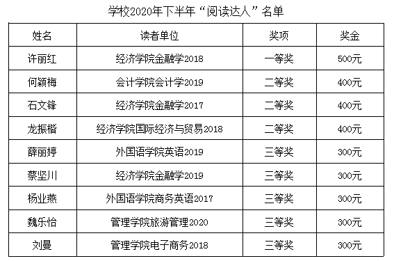 为大力推进“书香广商“校园建设,全面提高学生文化素养,培养我校高质量应用型人才,根据《广州商学院“一人一书”计划实施方案》规定,经对2020年下半年具有评选“阅读达人”资格的前20名同学的读书心得进行评审,并公示无异议,现评出“阅读达人”一二三等奖共9名,分别获得读书奖金一等奖500元、二等奖400元、三等奖300元,具体名单如下。