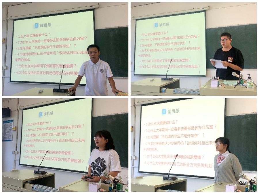 谷颐老师先以本书作者求学、求职和创业的成长故事引入领读内容,详细讲述了浮躁的信息经济社会大学生“读大学,究竟读什么”,重点从大学生涯息息相关的学习、考研、留学、求职等方面展开分析,强调大学生和非大学生最主要的区别绝对不在于是否掌握了一门专业技能。她建议,学生从大一入学开始就要做好职业规划,明确未来四年的努力方向,在今后的学习、生活、考研、留学、求职、创业等方面少走弯路,积极向上,奋发努力,圆满完成大学的学业,成为身心健康,国家需要的栋梁人才。通过本场领读,学生们明白了读大学读的不是大学的建筑,也不是六十一分都嫌多的考卷,而是自己的前程和年轻的人生。学生们表示,青春是有限的,智慧是无穷的,今后要培养独立的思想、创新的胆识,努力取得个人的成功。