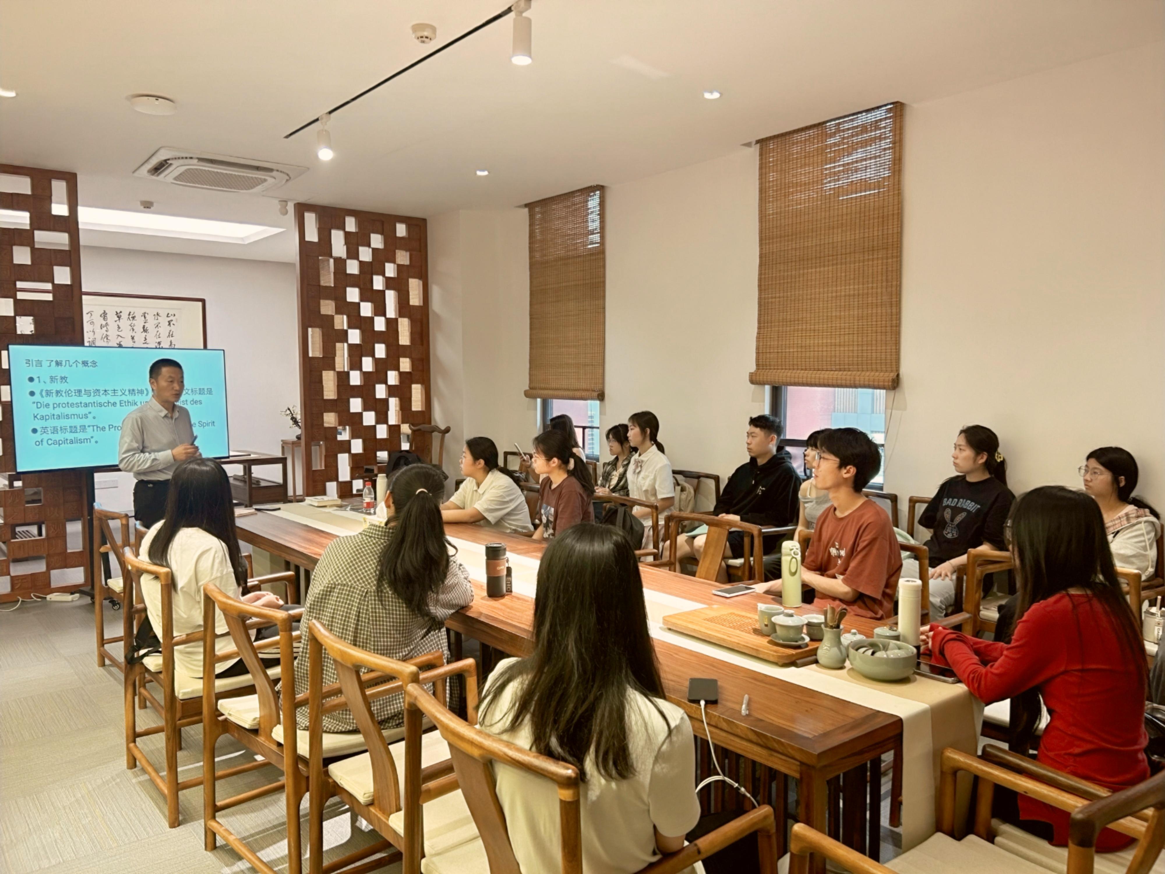 在分享会上,蒋明博士从韦伯的生平、学术贡献、书籍地位、核心概念等八个方面进行了详细讲解。在讲解过程中,同学们积极思考,对新教、新教伦理及资本主义精神等关键概念有了清晰认知。韦伯所理解的资本主义精神区别于传统认知,强调对非理性欲望的抑制,以及通过理性的企业活动追求持续利润,将世俗工作视为神圣使命,这些独特观点引发了同学们的浓厚兴趣。