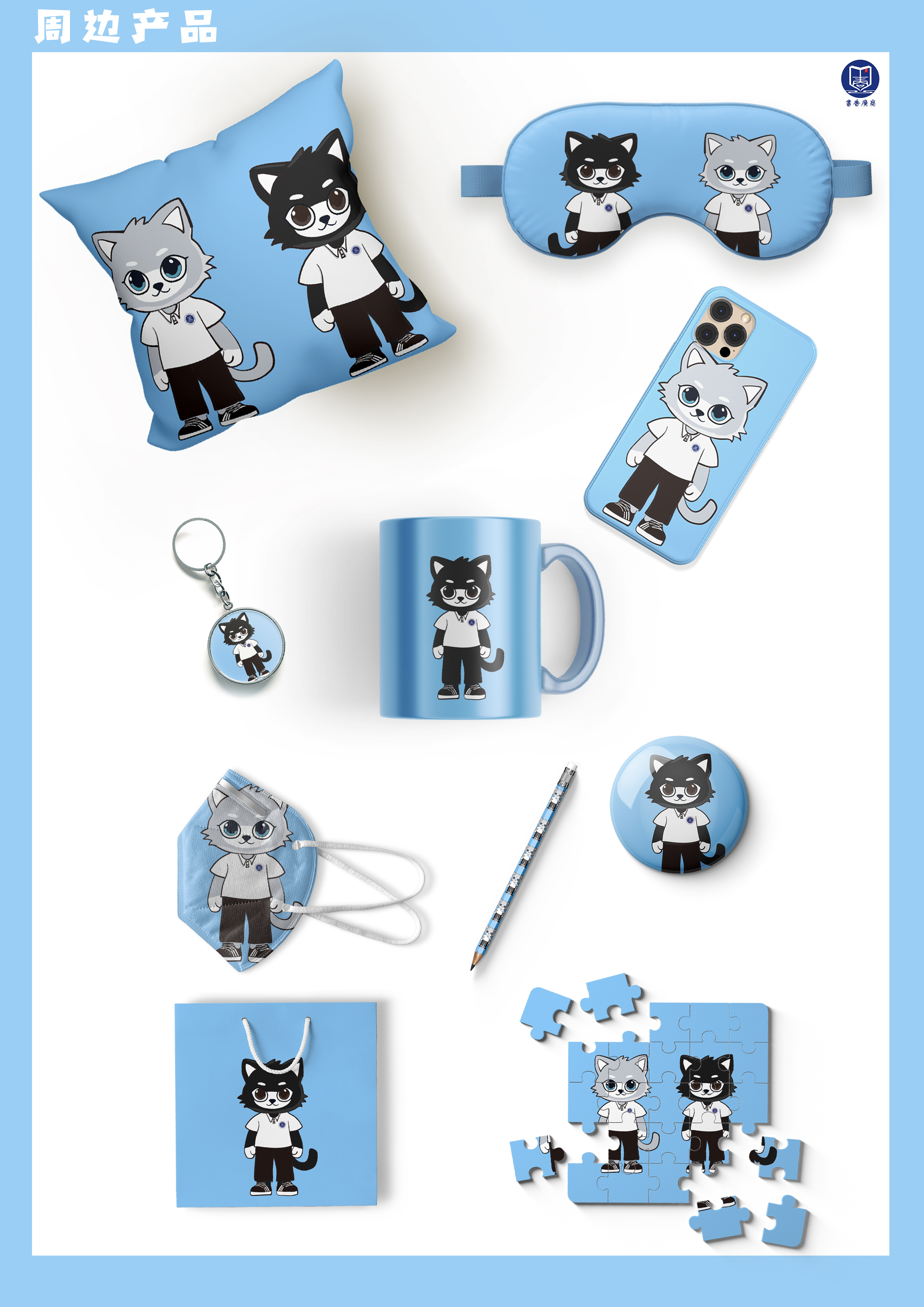 以“图书馆布偶猫 书香文化”为原点,将广商特色融入ip形象,传递“阅读育人、文化塑魂”的品牌内涵。原型灵感来自广州商学院图书馆“喵言书语”阅读空间里面的一只布偶猫,它温顺优雅,契合图书馆宁静氛围;头顶上翻开的书籍装饰,呼应“书香广商”主题。商小喵的五个分身——“德、智、体、美、劳”,分别对应广商人的核心素养:德者持卷讲礼,智者解谜经典,球者跃风云,美者绘岭南,劳者植绿护书。