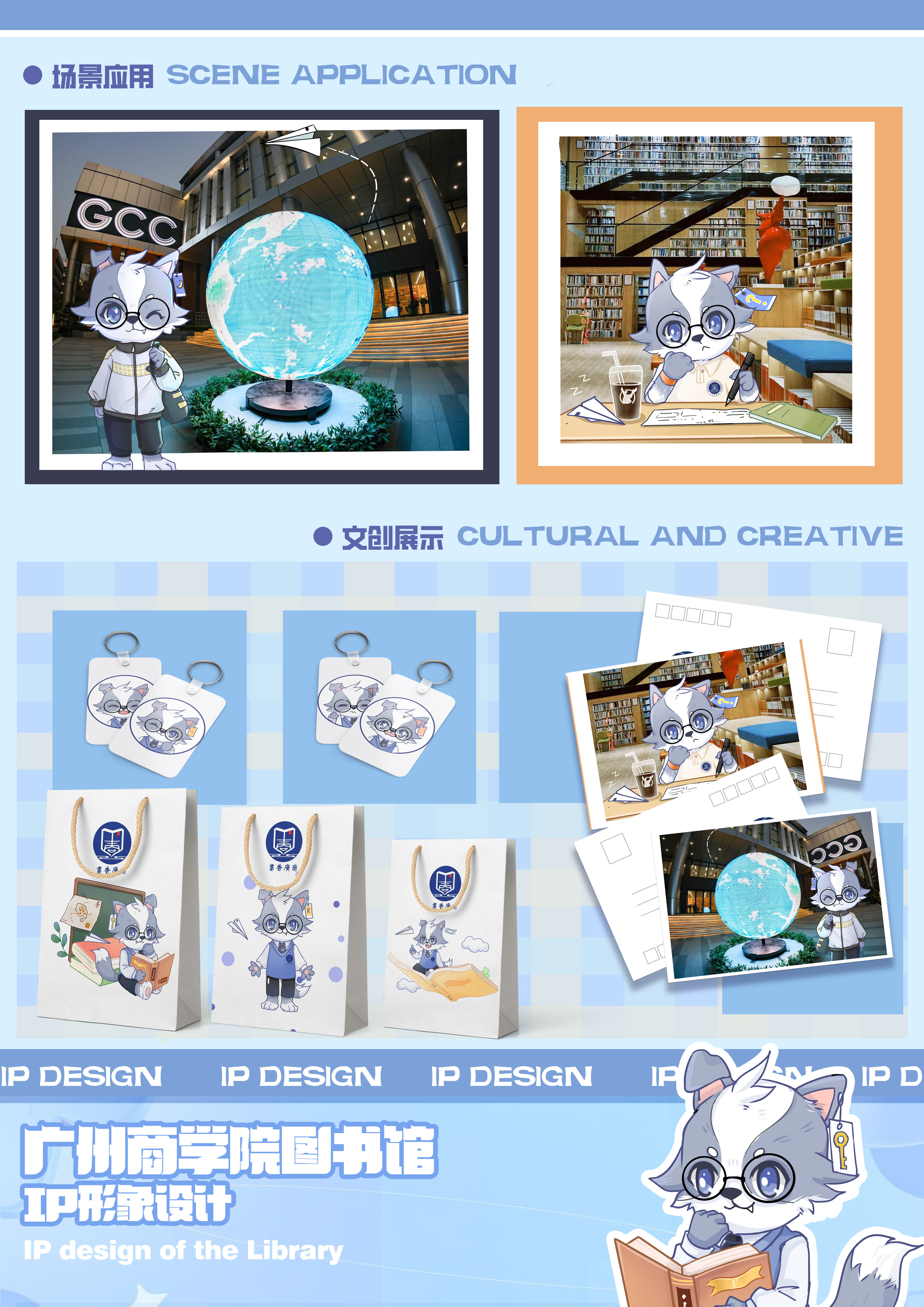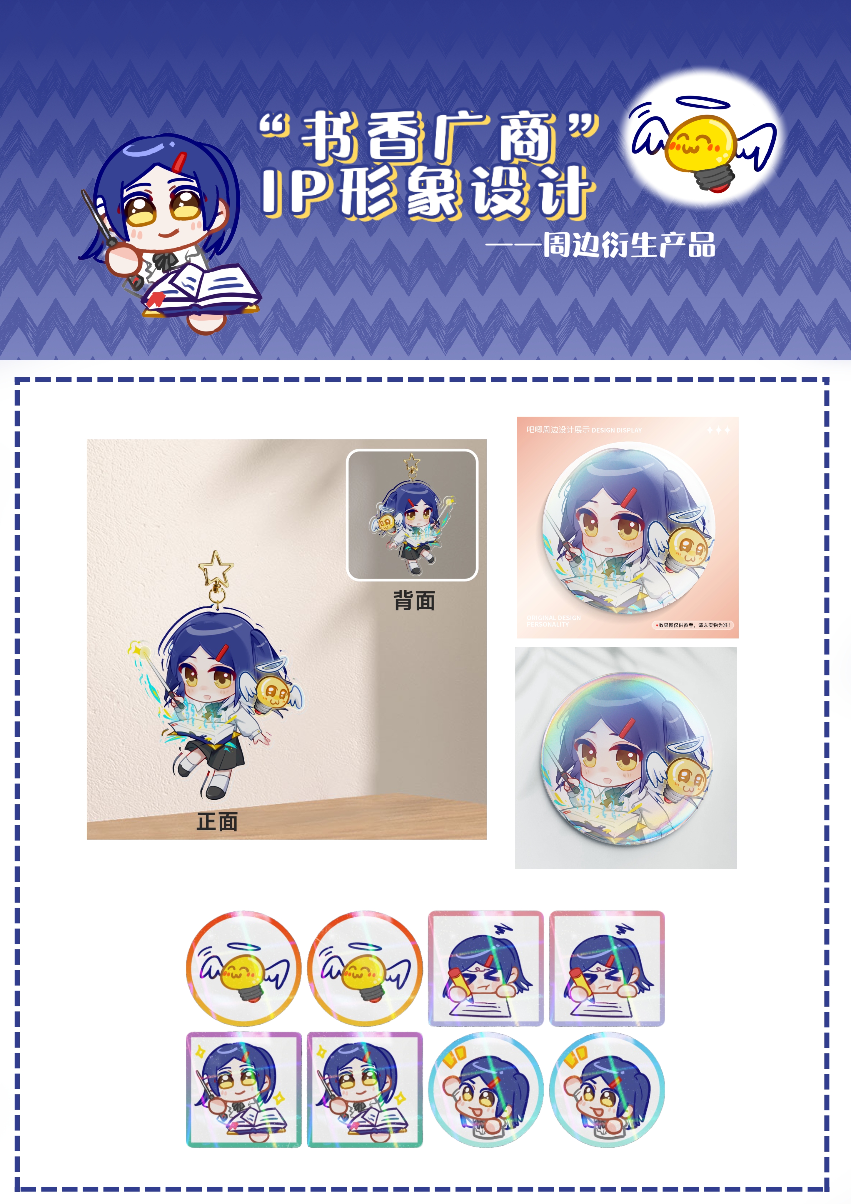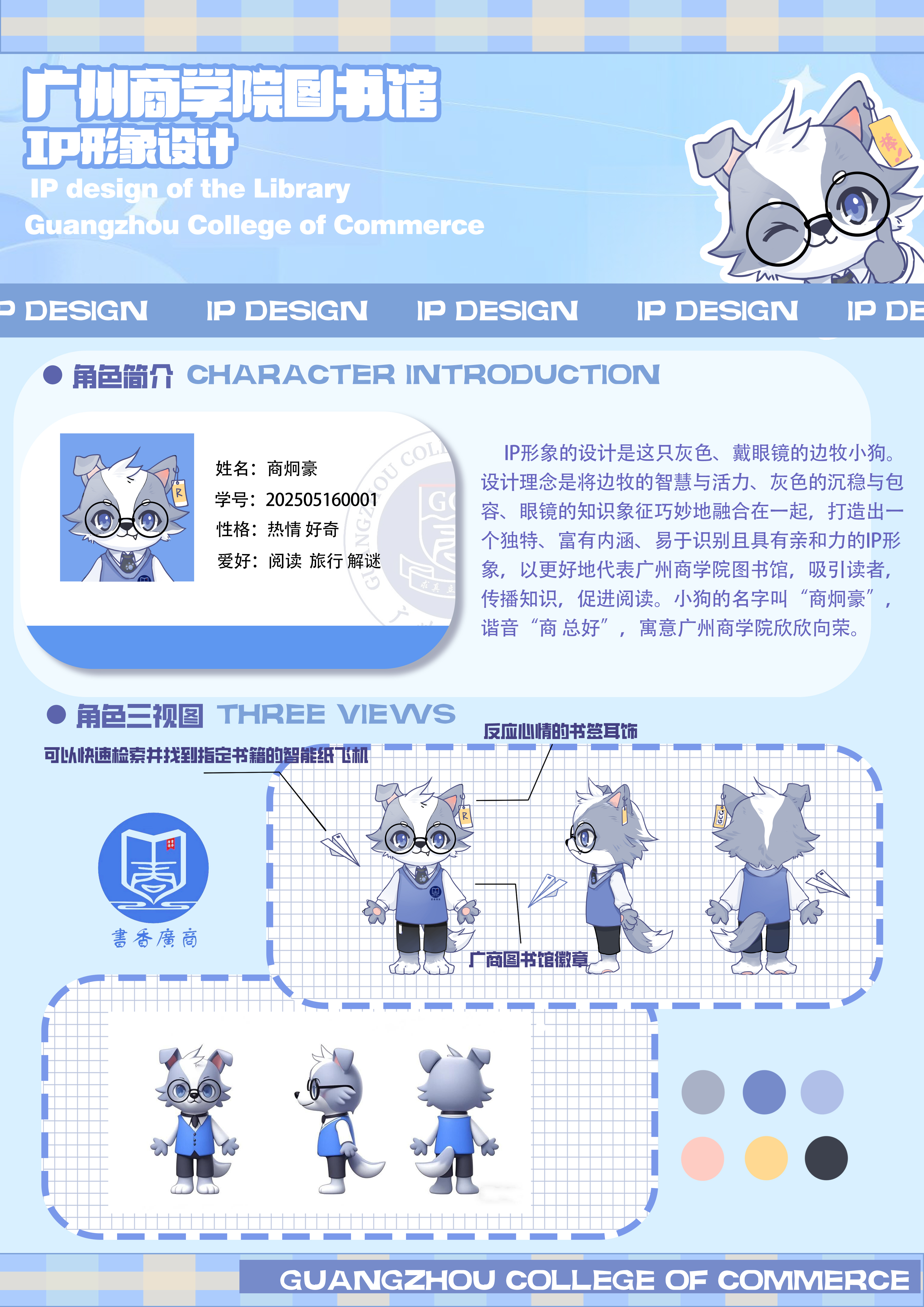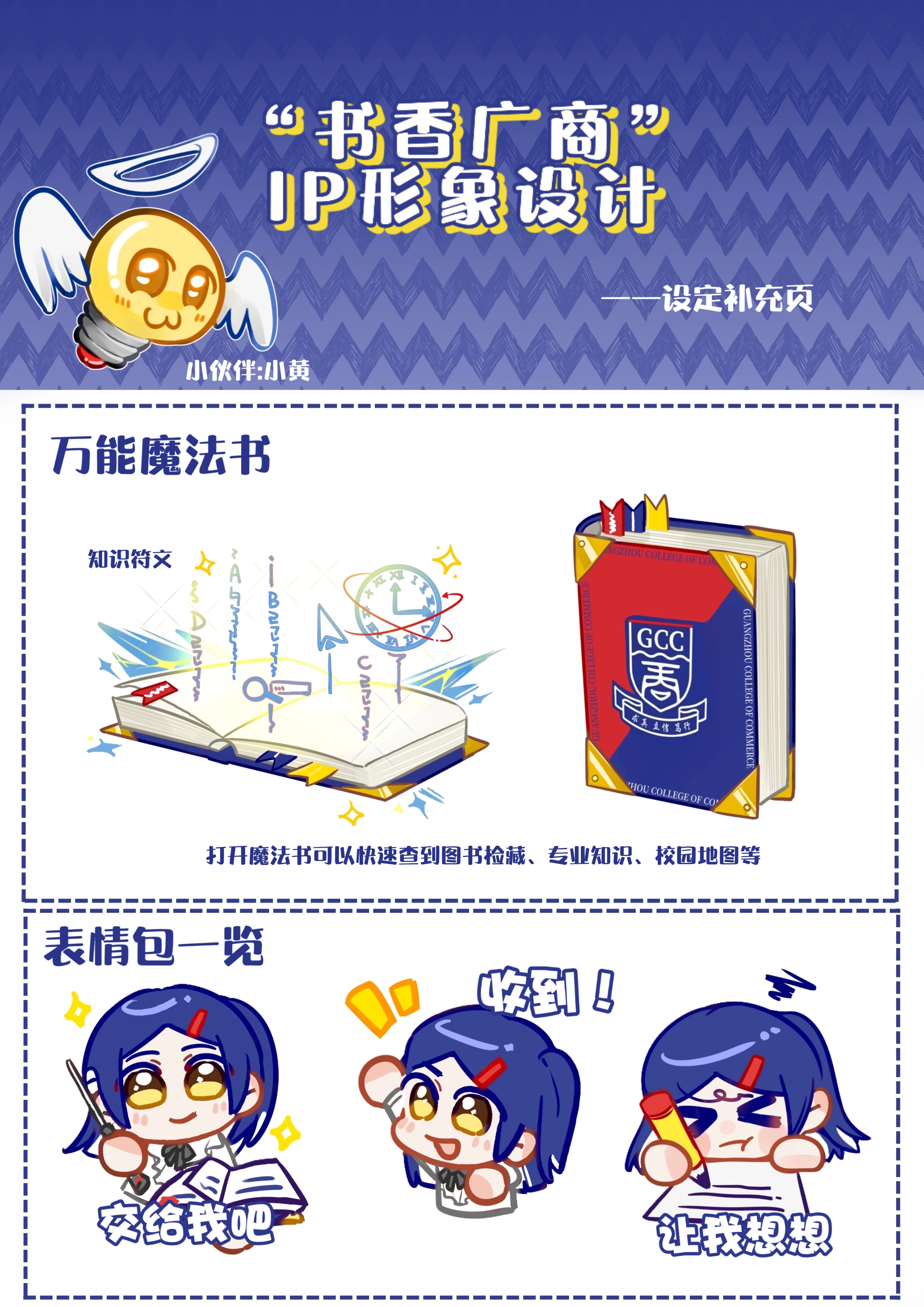 设计理念:该ip设计形象参考了广州商学院的校徽logo的主体颜色,以蓝白为主,红色做点缀,直观感受该ip形象与校园的联系。