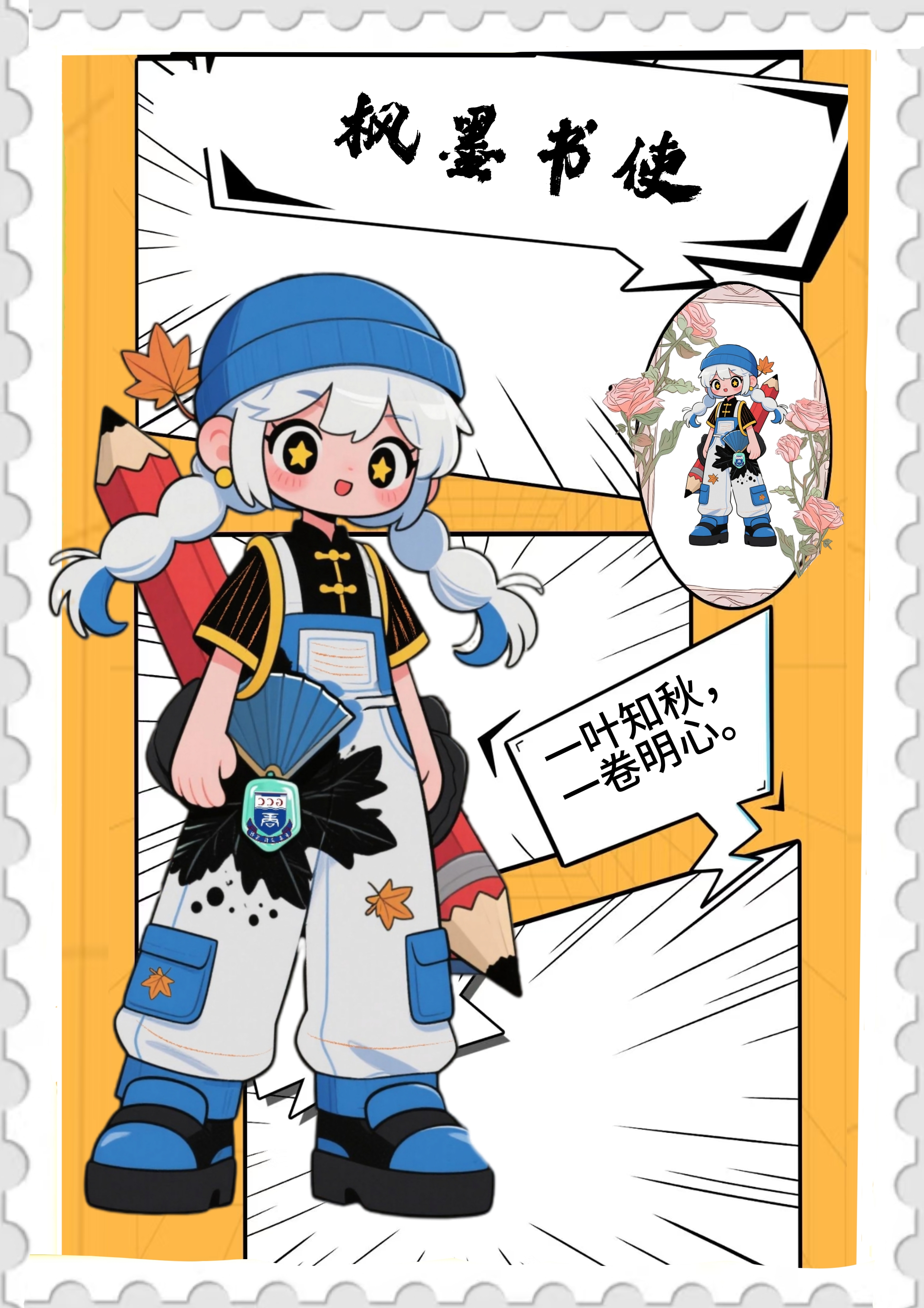 “传统灵物 现代交互”的设定,传递“阅读是自由而非束缚”的价值观,主形象“枫墨书使”为穿着玄墨黑的唐装上衣少年,腰间携带可投影诗词的“千页扇”,象征传统与创新的交融,枫叶象征广商人的热情与学术活力,玄墨黑呼应书香底蕴,校徽玉牌强化归属感。陪伴形象“砚语雀”为砚台纹理玄凤鹦鹉,尾羽化毛笔,飞行时洒落墨色星辰,可幻化成短句浮空。“毒舌鹦鹉”与“温柔书使”的反差萌,塑造有记忆点的角色关系。