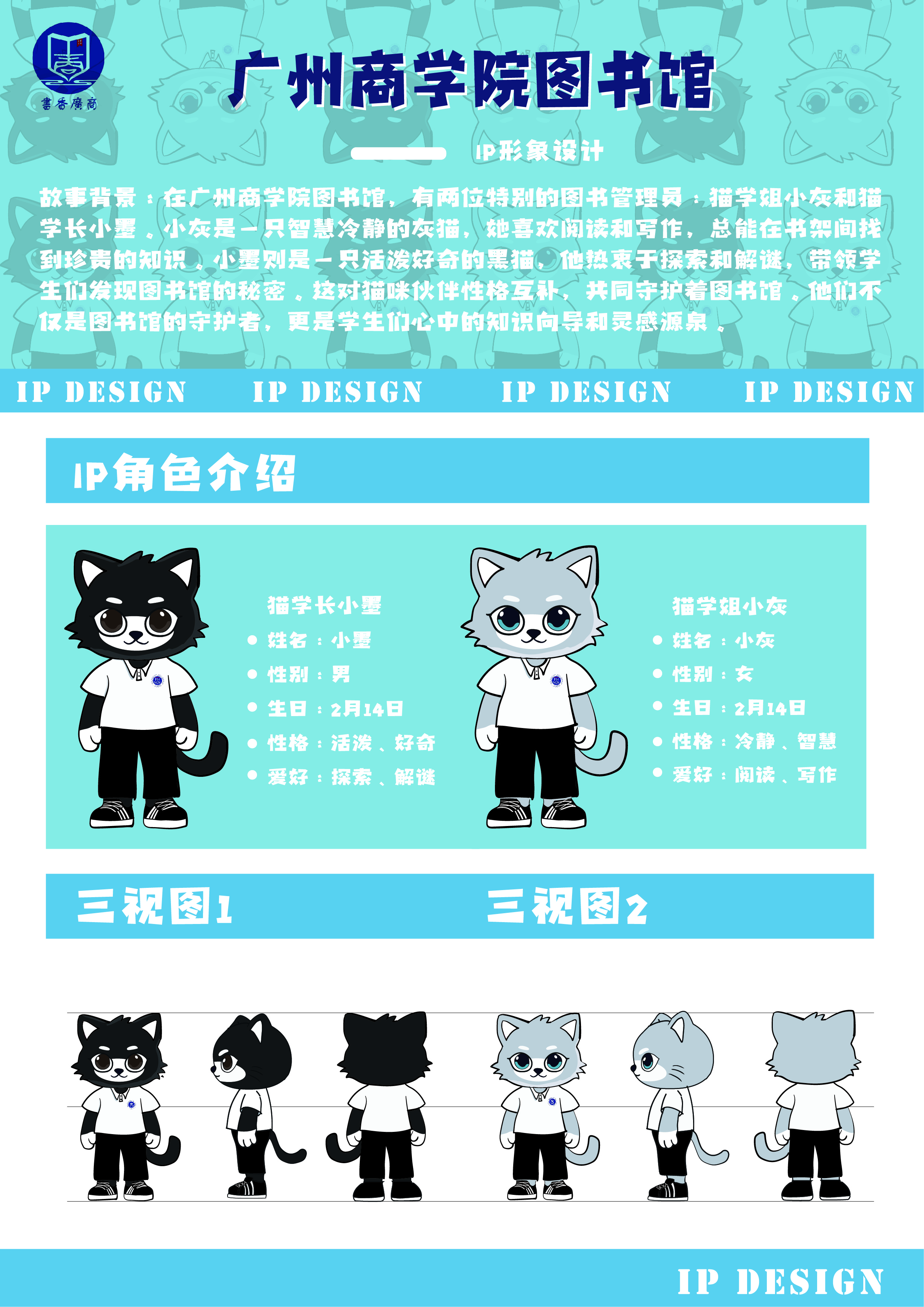 本设计以广州商学院图书馆为背景,以喵言书语里的小猫为灵感,创造了两位可爱的图书管理员小猫形象:聪明的小灰和活泼的小墨。通过拟人化的卡通风格,赋予他们独特的性格和爱好,旨在吸引学生对阅读和学习的兴趣。角色设计简洁明快,易于识别,同时通过三视图展示,增强了角色的立体感和亲和力。设计融合了现代卡通风格与教育元素,传递出了图书馆的亲和力和知识的魅力。这些小猫形象活泼可爱,与图书馆的书香氛围相得益彰。