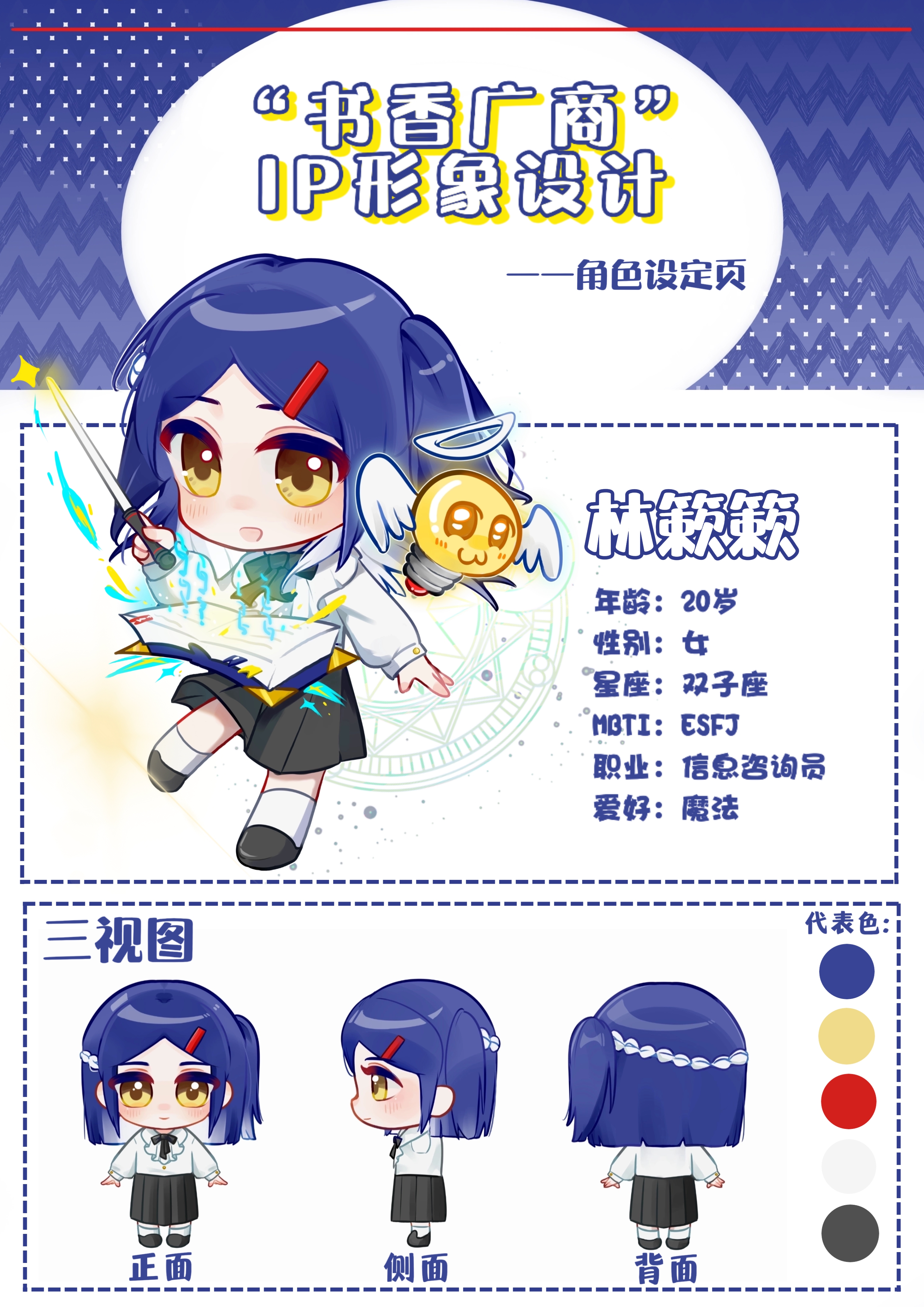 林簌簌设计思路:该ip形象采用大学生作为参考对象,贴近生活,在碰到不懂的问题,想探索新知识的时候,可以使用“魔法杖”,翻开书籍找到答案。小黄设计思路:成长的路上总会枯燥无聊,迷茫的时候出现一个伙伴,可以与它倾诉,它会倾听你的心声,给出建议,它的陪伴促进林簌簌的成长。