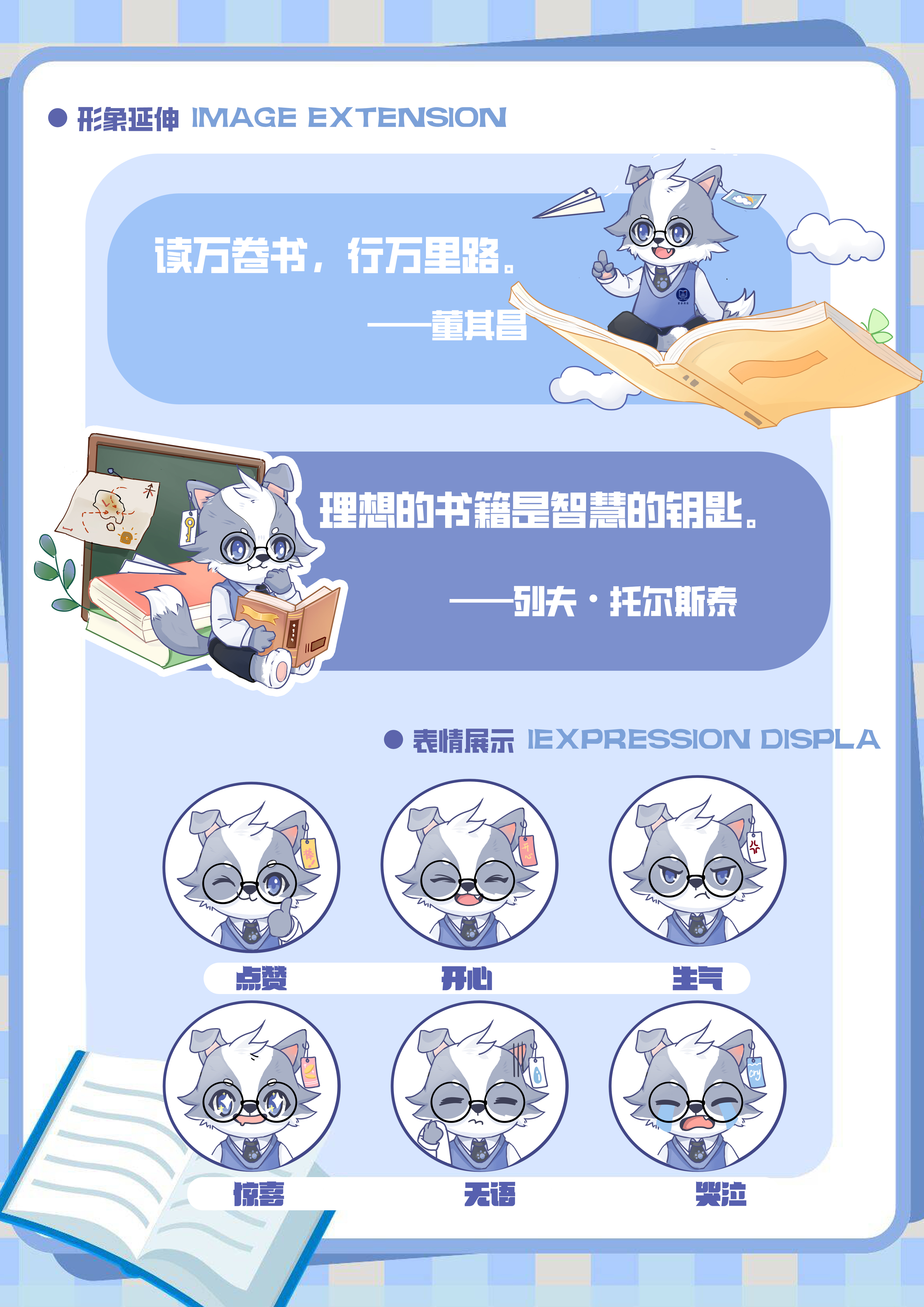 设计理念:将边牧的智慧与活力、灰色的沉稳与包容、眼镜的知识象征巧妙地融合在一起,打造出一个独特、富有内涵、易于识别且具有亲和力的ip形象,以更好地代表广商图书馆。这个设计不仅是一个简单的卡通形象,他还代表着智慧、活力、沉稳、专业、包容、知识等理念。这个设计简洁明了,具有很强的可塑性,可以衍生出各种不同的表情、动作和周边,满足图书馆不同场景的宣传需求。