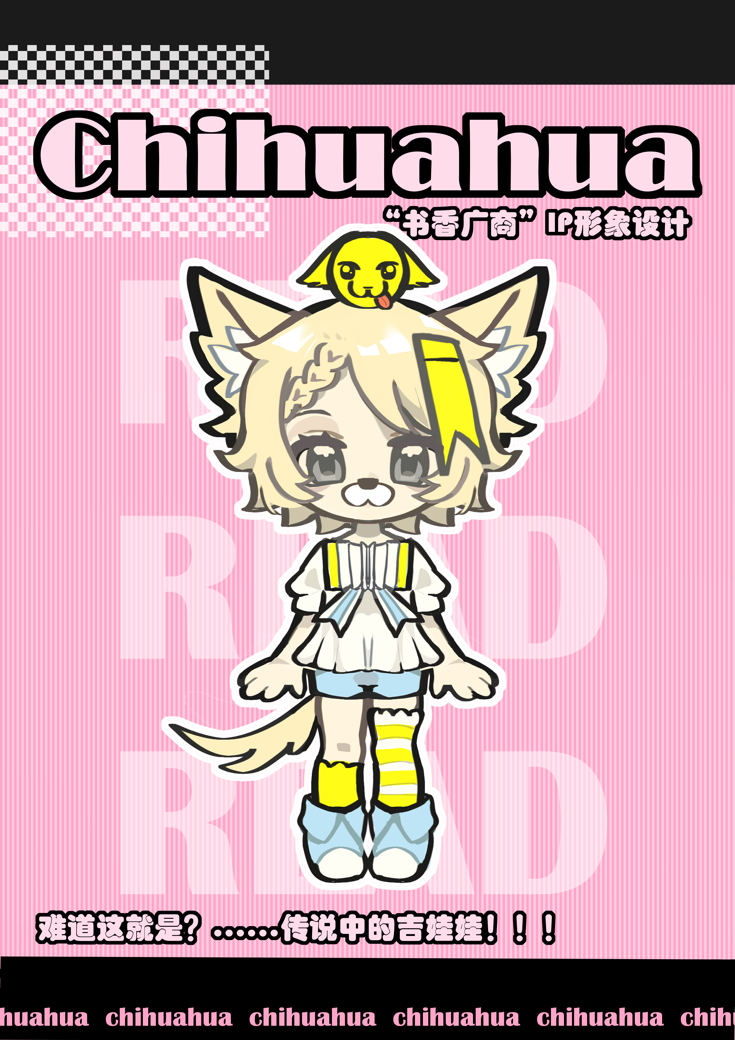 该ip设计采用了吉娃娃作为设计形象,可爱的吉娃娃具有亲和力,更容易被大众所接受。在配色上我使用了温和的黄色和白色,用一些淡蓝色进行点缀,画面简洁明朗。吉祥物胸前的蝴蝶结其实是一本书籍,头上的黄色装饰是书签,呼应“书香广商”这一“阅读”主题。