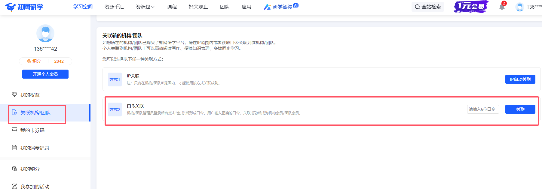 2. 登录知网研学后,点击【右上角的头像】,进入【个人中心】,点击栏目“关联机构/团队”,输入口令7exprk,点击“关联”,试用权限即可生效。
