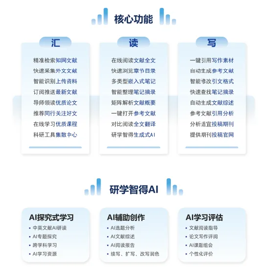 知网研学是中国知网旗下的研究学习工具,在文献检索、下载的基础上,进一步提供在线阅读(支持xml、pdf、caj等格式)、中外文献管理、笔记管理、论文写作、参考文献管理、多终端同步、选题、投稿、ai 等功能,赋能研究学习全流程。平台集成了上千项学术应用和服务,覆盖了从选题分析到论文产出全过程的关键场景,赋能研究学习全过程。