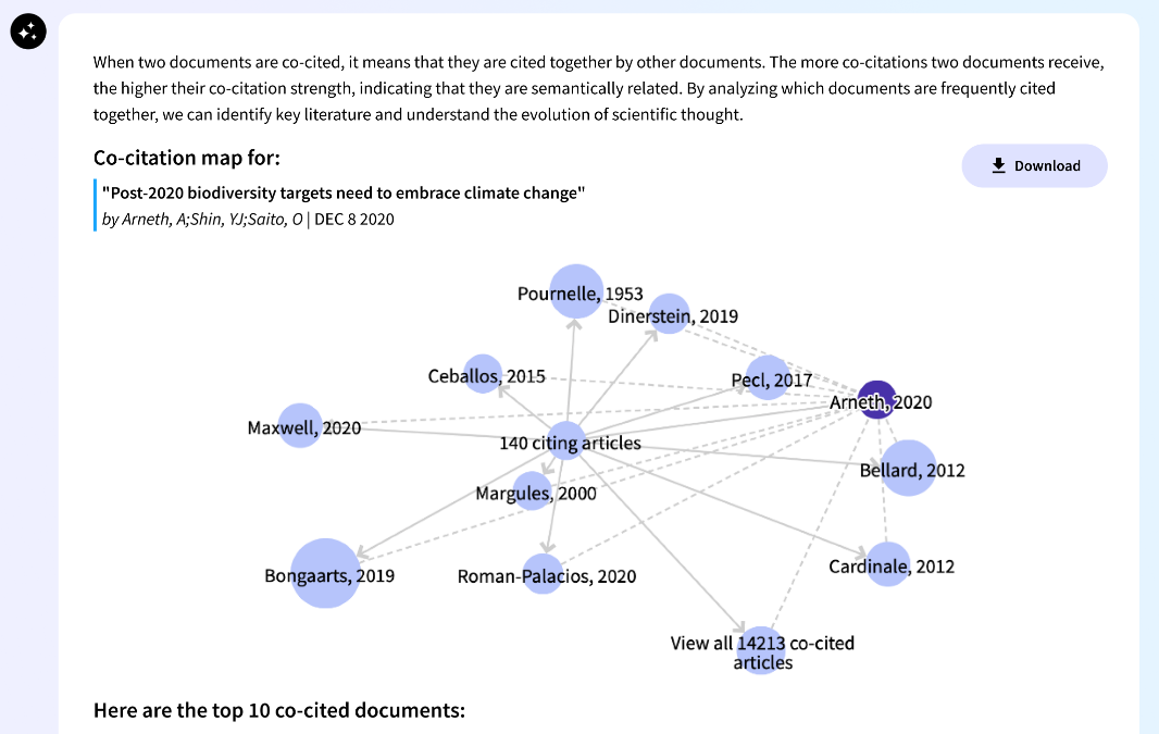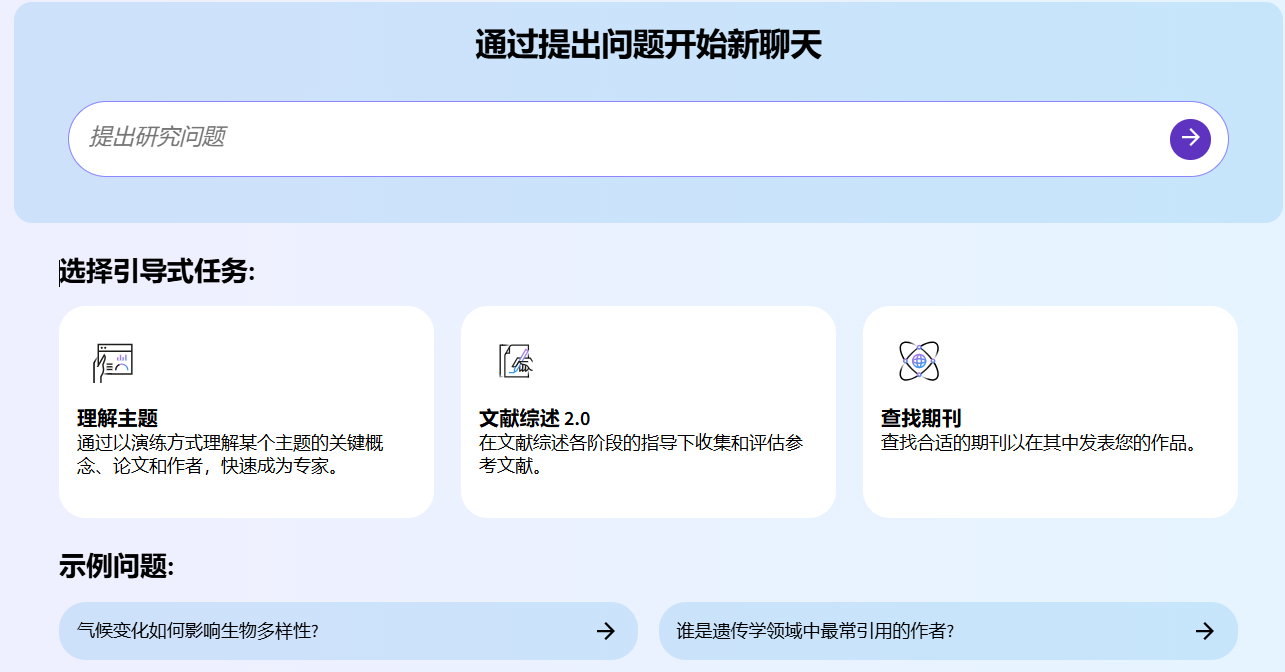 灵活的文献检索——用户可使用多种语言进行自然语言检索。该工具可在指定的研究领域内,根据超过120年的科研文献提供综述,揭示概念与论文间的关联。带有引导的提示(prompt)和任务——该工具会在用户检索时提供建议,引导用户结合上下文情境改进提示,扩大或进一步精炼需要涵盖的研究领域。引导任务可以帮助研究人员“理解主题”、获取“文献综述 ”或“查找期刊”,准确获取所需要的内容。