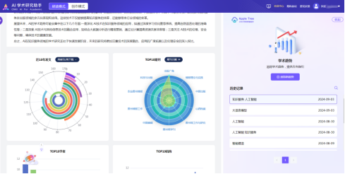 ②学术趋势:通过智能的数据分析和挖掘生成领域概貌,并以图表方式呈现领域发展脉络,为科研人员提供一个全面、深入的领域动态观测途径和精准、有价值的趋势分析。