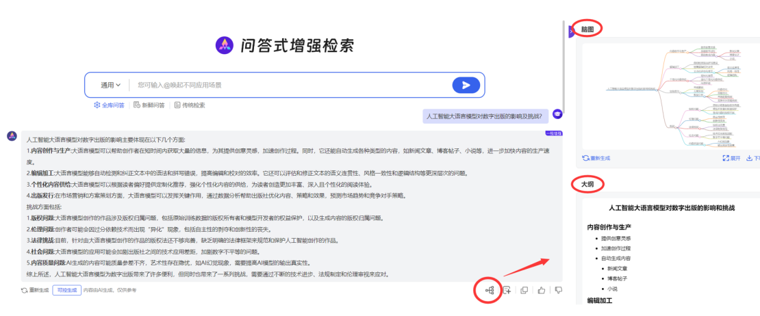 ①学术问答:用户只需以自然语言提问,ai 助手将在知网全库范围寻找精准权威的体系化解答。问答结果可一键生成脑图和大纲,辅助用户快速掌握核心要点,加深知识理解。